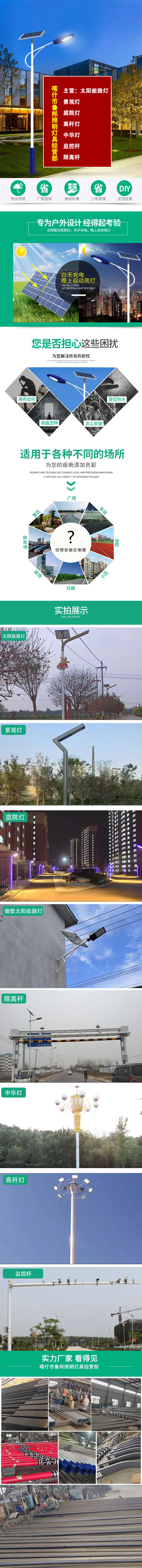 主营产品有:庭院灯、景观灯、路灯、草坪灯、中杆灯、高杆灯、太阳能灯等多个规格及品种。我们积极吸取国内外先进道路灯具产品的特点,通过不断研究开发在设计上达到合理、规范、准确、快速。灯杆采用自动斜剪板裁板,灯杆焊缝采用大功率自动合缝埋弧焊,焊缝成型美观、牢固耐用。